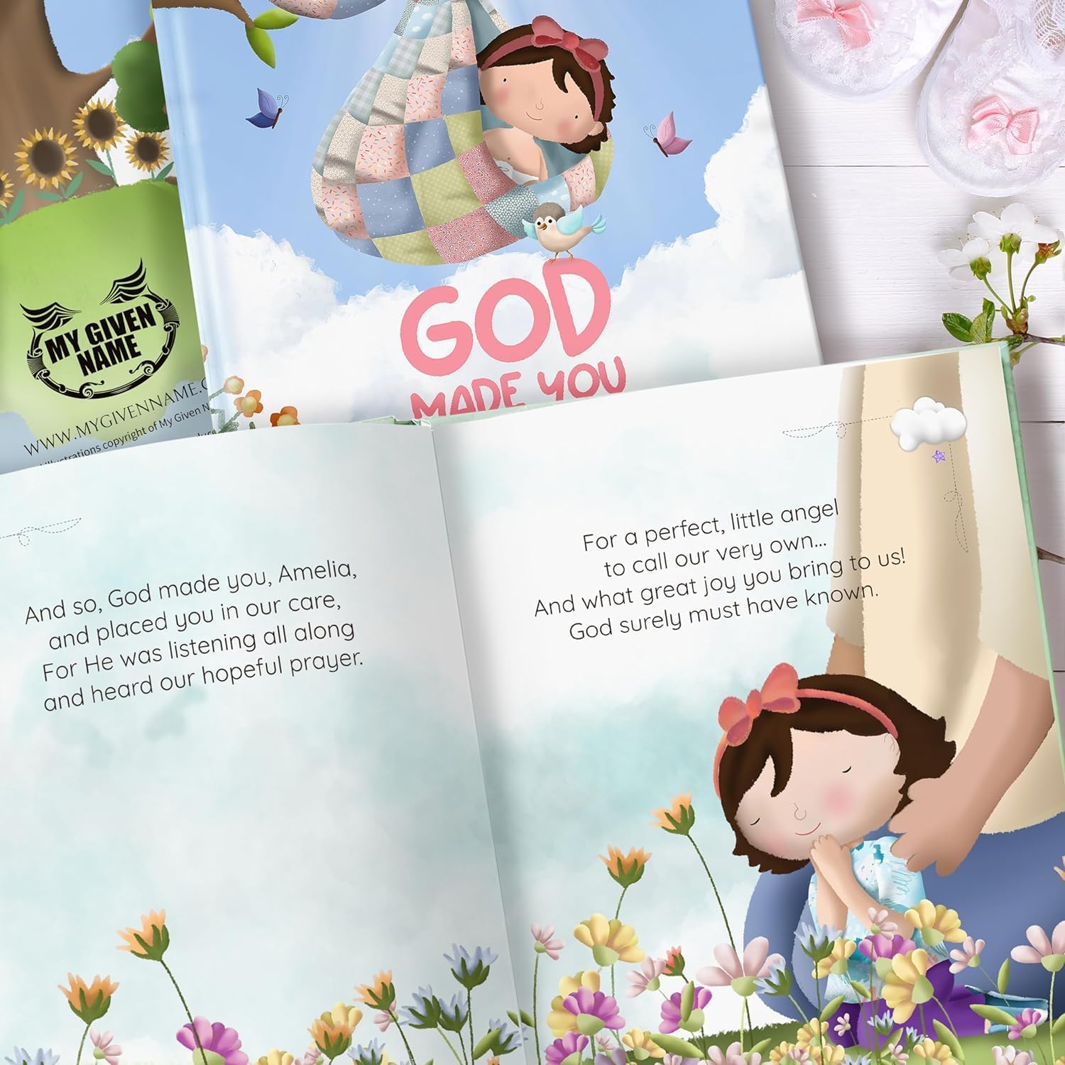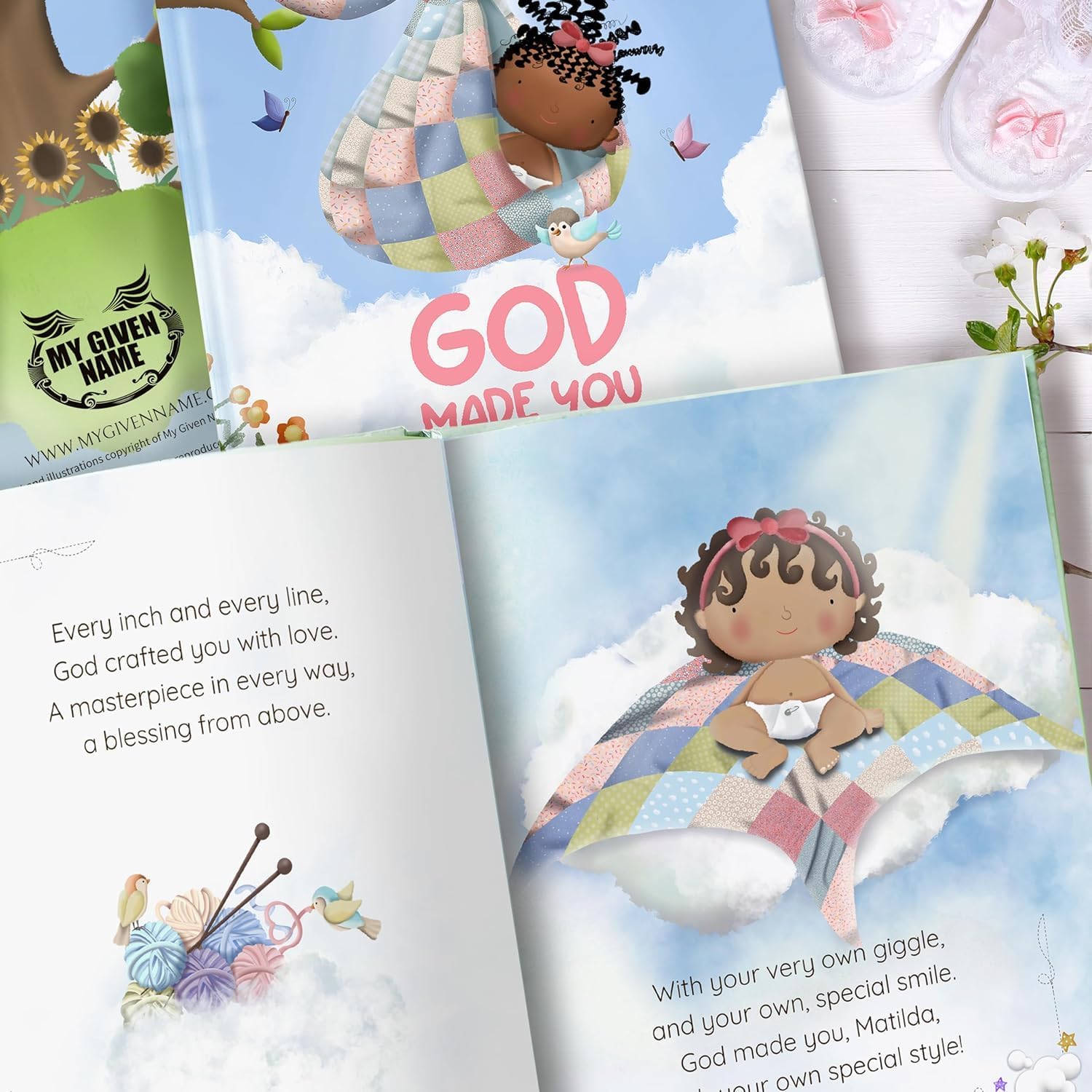 Introducing the 'God Made You' Personalized Book โ a beautiful, heartwarming journey that weaves your child's uniqueness into a story of divine love and purpose. This book isn't just a reading experience; it's a personalized voyage that affirms your child's special place in the world. Celebrate the individuality of your little one with our cherished personalized kids book. This keepsake is a testament to the loving bond you share. It's not just a story; it's a narrative that nurtures self-esteem and instills a sense of divine purpose, making it a meaningful gift for girls and boys alike. Crafted with attention to detail, our book allows you to customize characters to mirror your child's appearance. Choose from a range of illustrated characters, personalizing hair and skin color, to create a representation that resonates with your child. This customization makes it an ideal choice for both boys and girls, ensuring they see themselves in their own personalized story book. The bookโs pages are adorned with the exquisite artwork of Marianella Aguirre, an award-winning illustrator. Her tender illustrations bring warmth and love to each page, making the book a visual delight. Available in Softbound, Premium Hardback, and Deluxe Cushioned Hardback editions, each binding option showcases exceptional quality, ensuring this personalized baby book becomes a treasured family heirloom. Our personalized book transcends a mere tale; itโs an enlightening journey teaching children they are 'intricately crafted in the eyes of God.' This narrative fosters self-esteem and a sense of divine purpose, perfect for baptisms and a cherished gift for both girls and boys. 'God Made You' is more than a book. It's a personalized celebration of your child's unique journey, and a reminder of their cherished place in God's plan. Ideal for special occasions like newborn celebrations, Christenings, and first birthdays, this book is a gift that will be treasured for years to come.